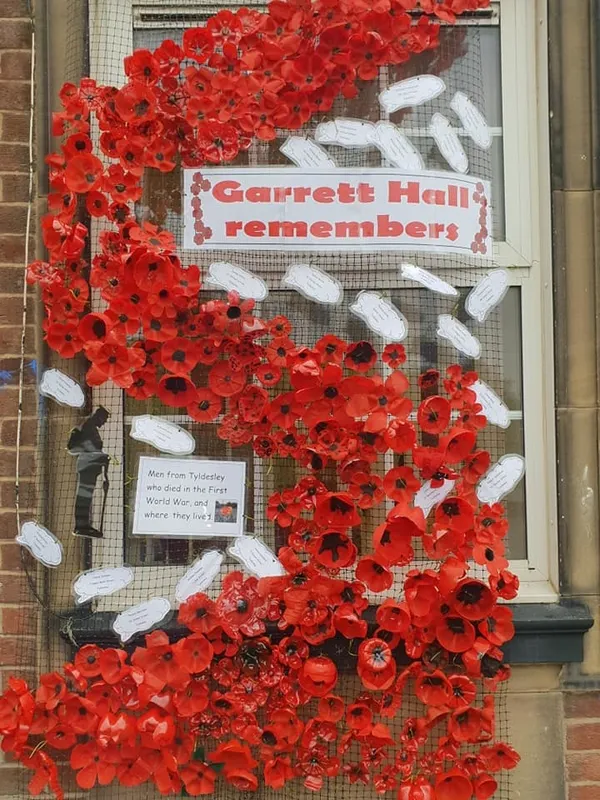 We are proud to showcase our beautiful poppy installation as a tribute to all who lost their lives in World War One. Our tribute marks this years centenary. Each child at Garrett Hall painted a poppy (using the bottom of a plastic bottle) and each poppy is now hung on our display which cascades down the front of our school. We have also included tributes to some of the men that fought and died during the war who were from Tyldesley.