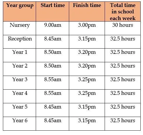The school times below are the official compulsory start and end times to the school day, it does not include any before or after school clubs.